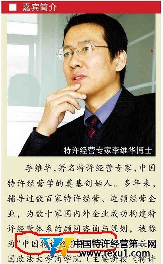 李维华,著名特许经营专家,中国特许经营学的奠基创始人。多年来,辅导过数百家特许经营、连锁经营企业,为数十家国内外企业成功构建特许经营体系的顾问咨询与策划,被称为“中国特许经营第一人”。现执教中国政法大学商学院(主要讲授《特许经营管理》课程)。 任中国政法大学特许经营研究中心常务副主任,“特许经营世纪精品丛书”主编。中国特许经营第一网(www.texu1.com)创始人、首席顾问等。